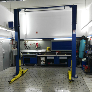 Hebebühne Kfz 4 Tonnen, hydraulisch mit Endabschaltung, für Höhe und Anschlag, und Sicherheitsrasten zur sicheren Arretierung der Arbeitshöhe.